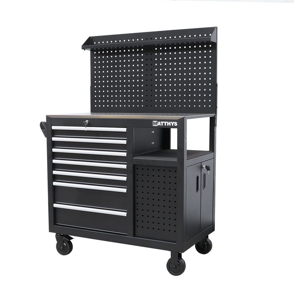 Este robusto banco de trabajo móvil, con un elegante acabado negro, encimera de acero inoxidable, tomas de corriente y puertos USB, y un panel trasero perforado, le ofrece infinitas posibilidades y le permite mover su trabajo y herramientas fácilmente por todo el taller. Desarrollado tanto para profesionales como para aficionados exigentes. Con 7 cajones claros equipados con alfombrillas de espuma y un armario lateral con 2 puertas, siempre tendrá un banco de trabajo organizado y eficiente al alcance de la mano. ¿Ha terminado de trabajar? Simplemente empuje el carro de vuelta a su lugar de forma rápida y sin esfuerzo.