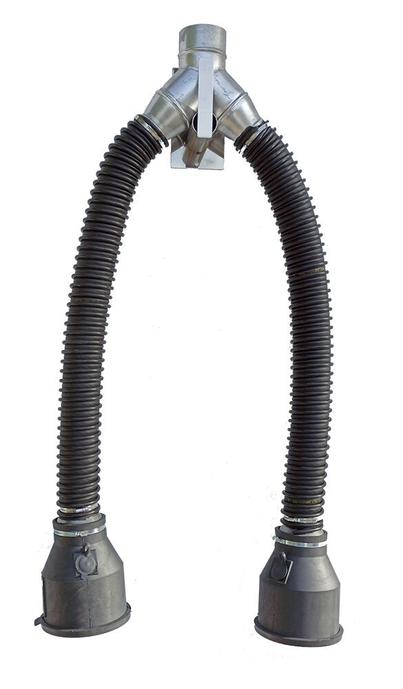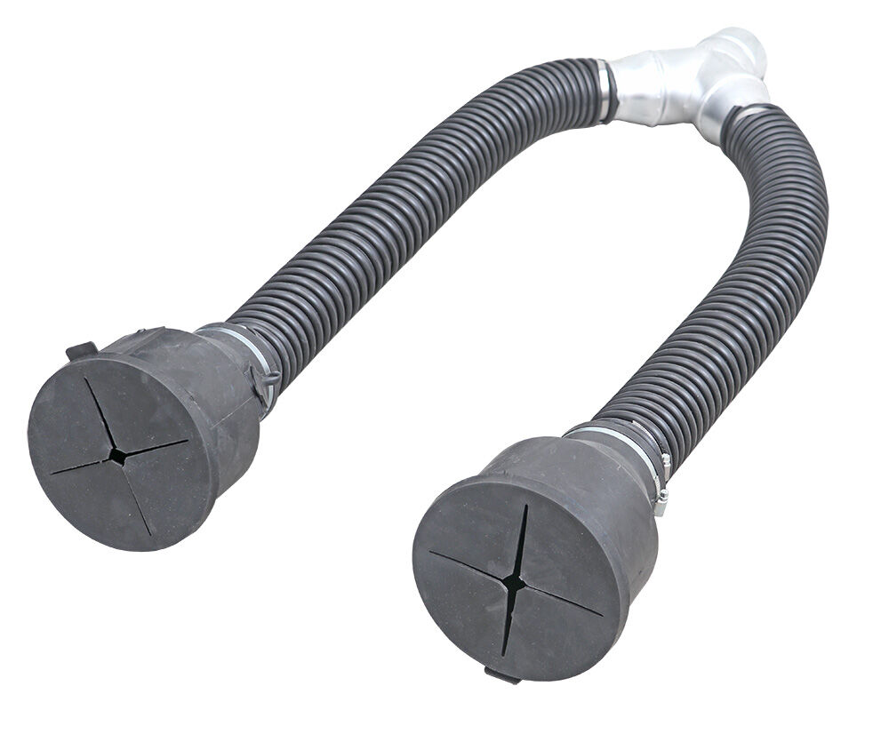 Kit para escapes dobles (coche/moto) compuesto por 2 mangueras flexibles de 1 m (Ø 75 mm) y un conector en Y, 2 boquillas de extracción de neopreno y un soporte de pared para colgar el kit. Este kit es adecuado para una manguera de 100 mm de diámetro.