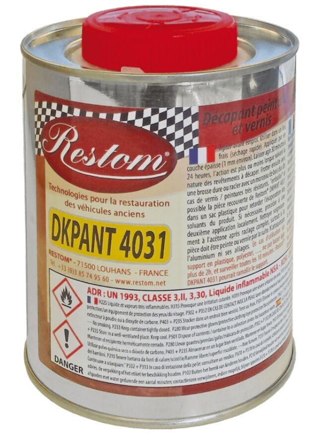 Restom®DKPANT 4031 es un decapante para eliminar la mayoría de pinturas y barnices. Adecuado para pinturas de carrocería (Poliuretano, Glicero, Celulósico, ...) y barnices aplicados sobre carcasas de aleación ligera. Propiedades:- Restom®DKPANT 4031 no ennegrece el aluminio ni sus aleaciones y no es agresivo para los metales. Uso en plásticos: máximo 2 horas con control regular.