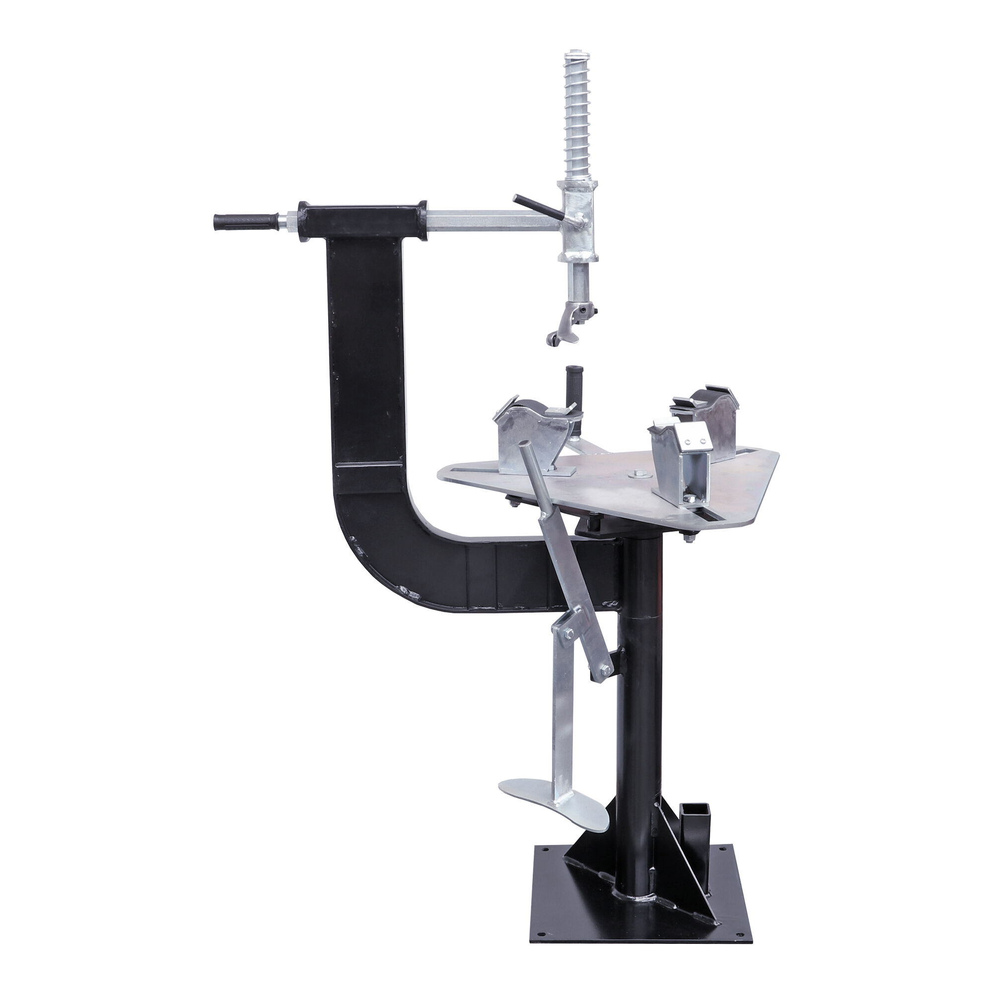 Desmontadora de neumáticos manual adecuada para una amplia variedad de neumáticos y ruedas, incluidos los montados en motocicletas, vehículos todo terreno, karts y buggies de golf. Funciona con ruedas centradas por cojinete o buje y se suministra con dos tijas centrales.