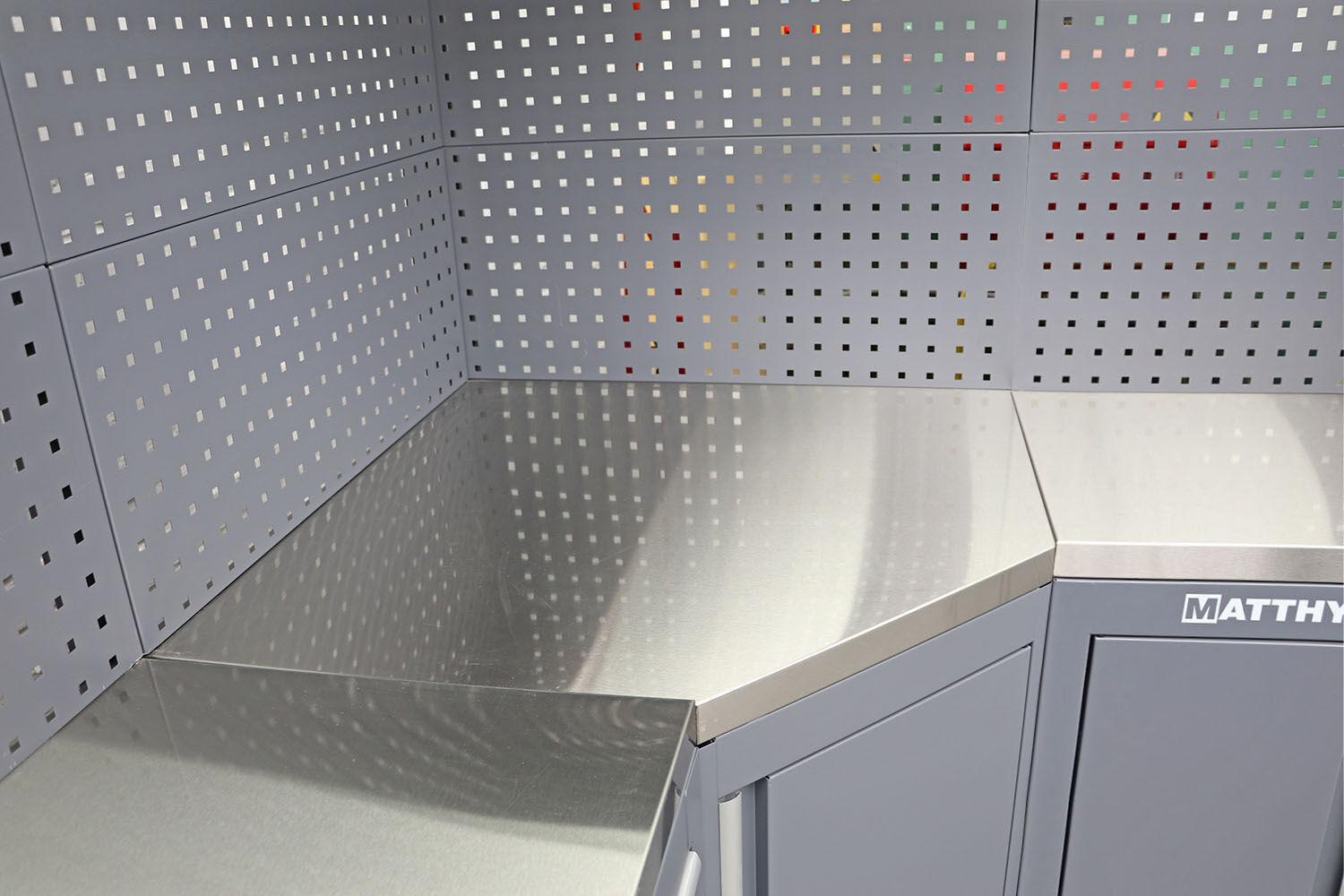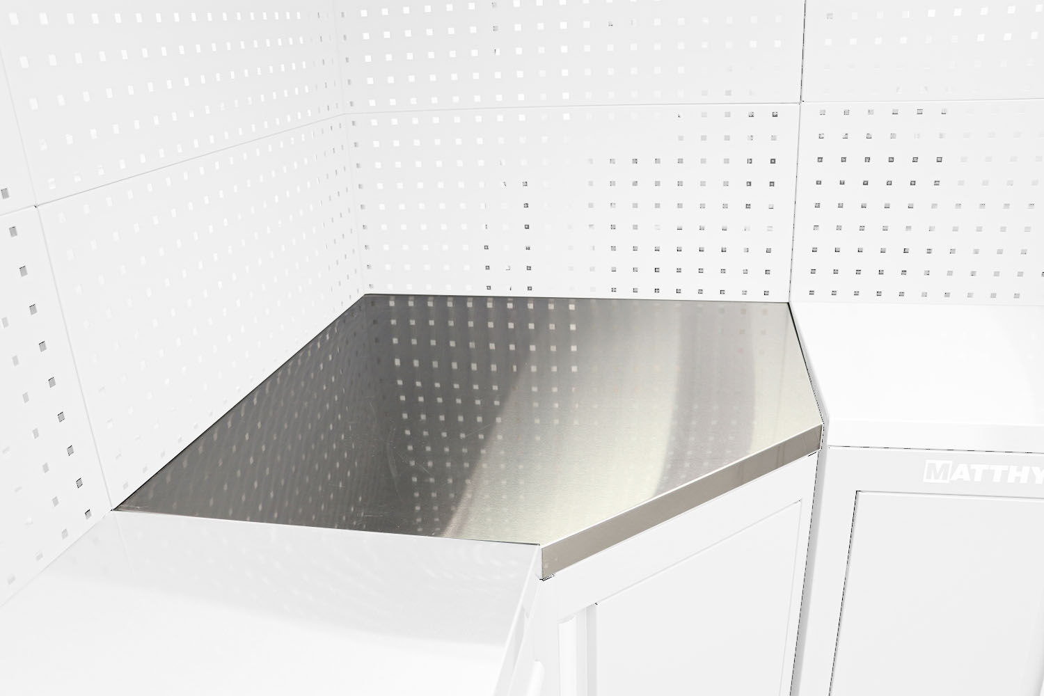 Encimera para mueble esquinero con revestimiento de acero inoxidable: duradero, higiénico y fácil de mantener.