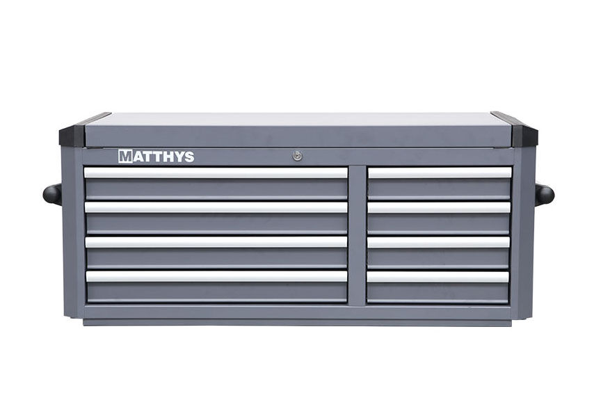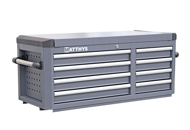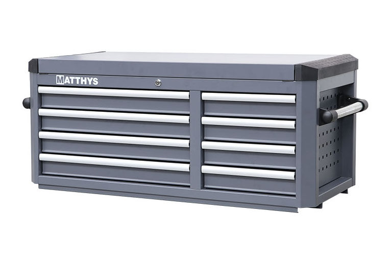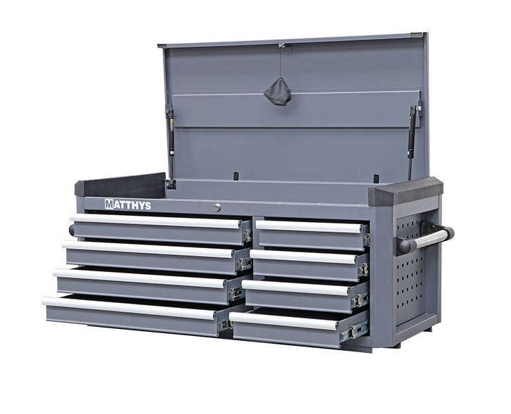 Caja de herramientas equipada con 8 cajones, con acabado en pintura en polvo granulada.