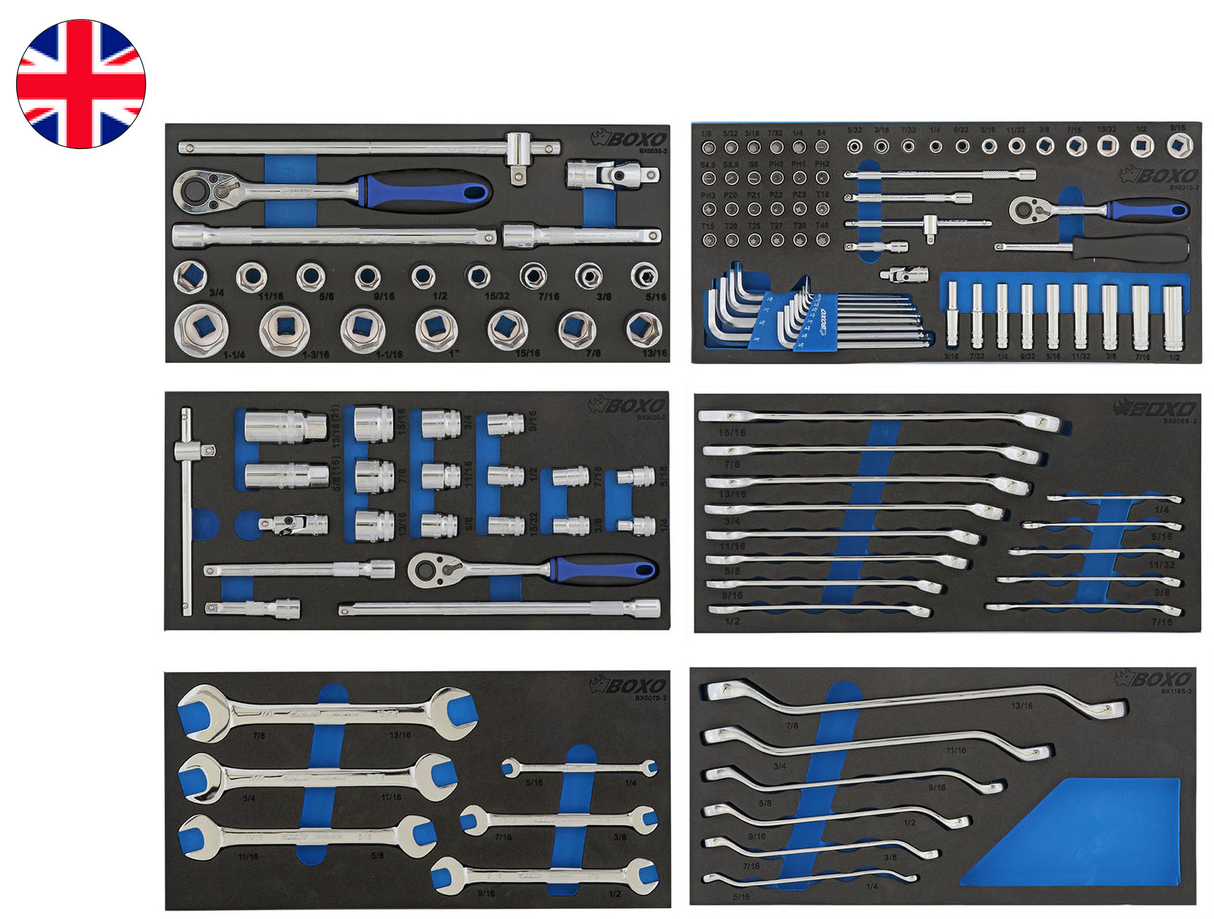 JUEGO BÁSICO COMPLETO DE LLAVES DE VASO Y LLAVES FIJAS EN SAE/PULGADAS Artículo: 200206