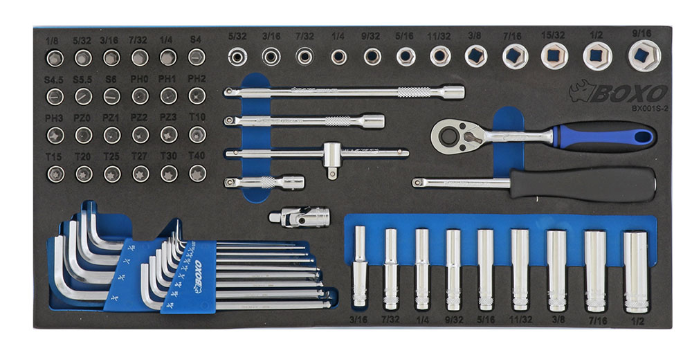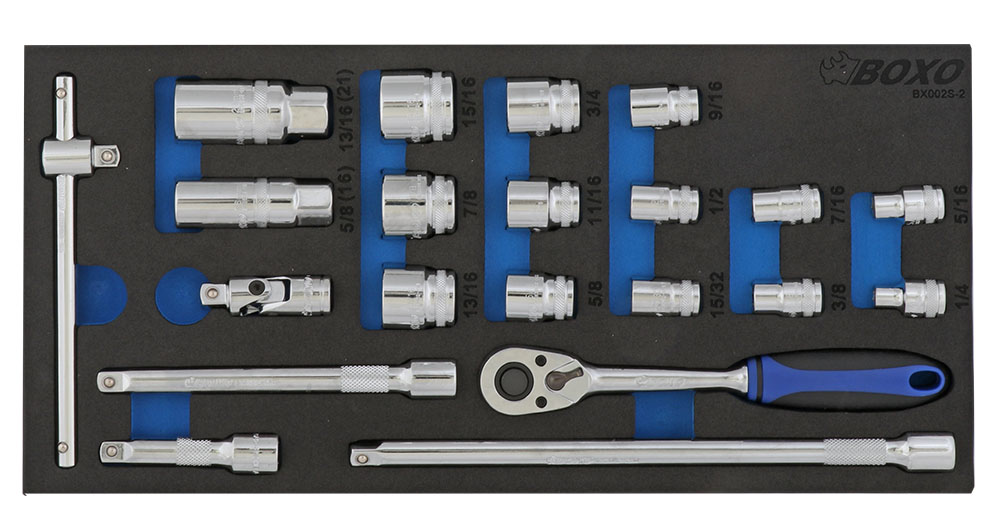 - Llaves de vaso SAE/pulgada (6Pt) 5/32”, 3/16”,7/32”, 1/4”, 9/32”, 5/16”, 11/32”, 3/8”, 7/16”, 15/32”, 1/2”, 9/16”