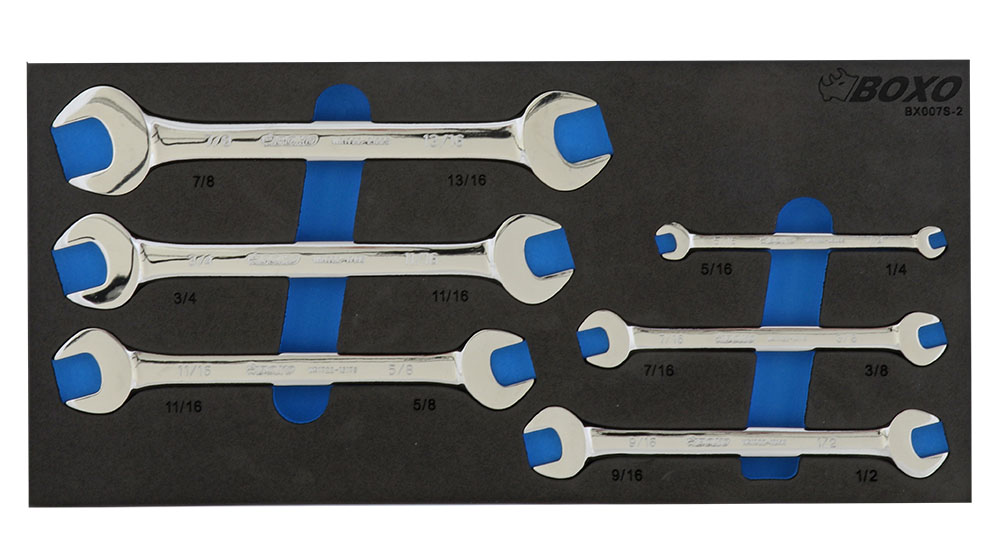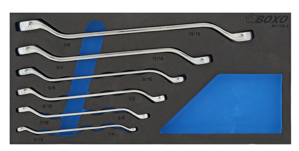 - Llaves de doble boca SAE de 1/4” x 5/16”, 3/8” x 7/16”, 1/2” x 9/16”, 5/8” x 11/16”, 11/16” x 3/4”, 13/16” x 7/8”