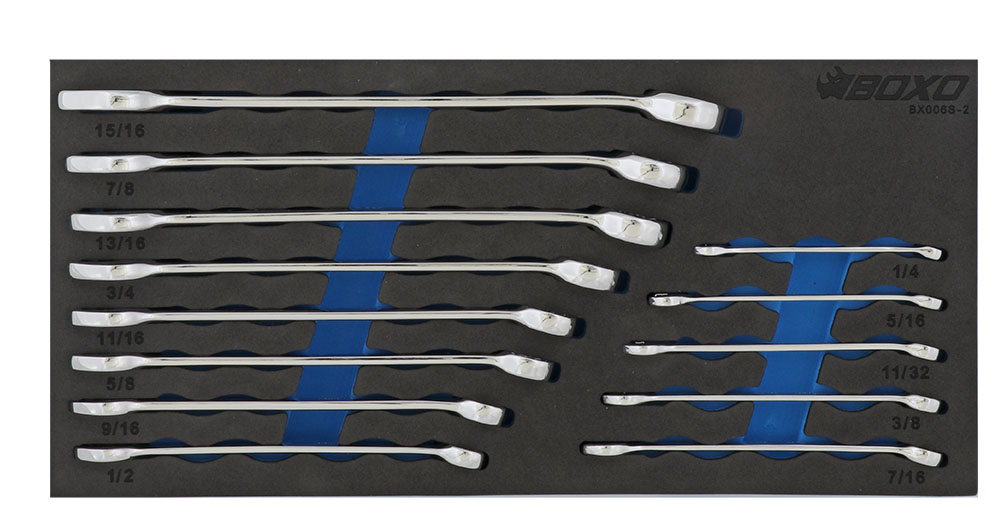- Llaves combinadas SAE de 1/4”, 5/16”, 11/32”, 3/8”, 7/16”, 1/2”, 9/16”, 5/8”, 11/16”, 3/4”, 13/16”, 7/8”, 15/16”