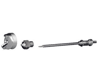Los distintos materiales requieren juegos de boquillas más pequeños o más grandes. Para obtener los mejores resultados, seleccione la boquilla de fluido adecuada. Un juego de boquillas incluye un cabezal de aire, una boquilla de fluido y una aguja.