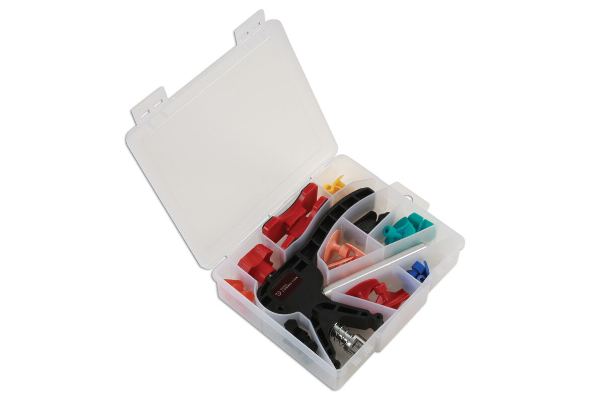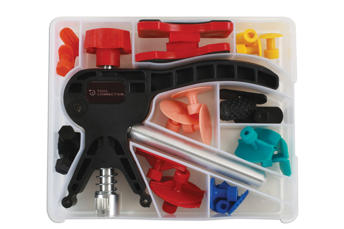El pegado es un proceso de reparación ideal cuando el acceso detrás de la abolladura a reparar es limitado. Es ideal para reducir pequeñas abolladuras. Viene con 24 almohadillas adhesivas surtidas, incluidas almohadillas redondas y elípticas partidas, que son adecuadas para diferentes formas y tamaños de abolladuras.