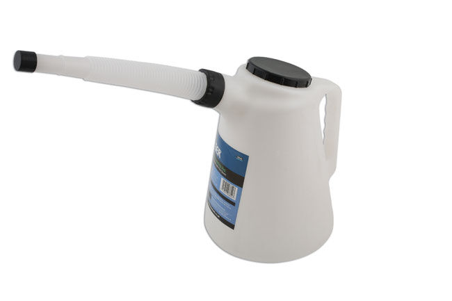 Apta para todo tipo de fluidos, incluidos la gasolina y el gasóleo, esta jarra dosificadora de 5 L con boquilla flexible viene con tapones para evitar derrames o contaminación.- Capacidad: 5 litros