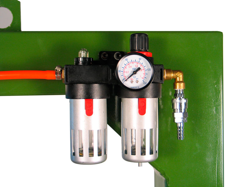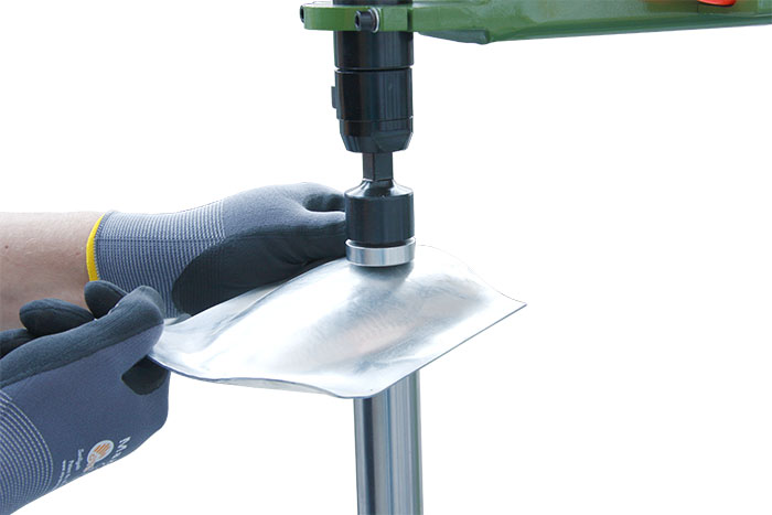 Potente martillo aplanador neumático. Moldea chapa de acero dulce de hasta 1,5 mm, aluminio y cobre de hasta 2,3 mm. Esta máquina se suministra con 1 molde inferior y 1 molde superior. La máquina se controla con un pedal de 230 V. Está equipada con soportes para moldes adicionales. El molde superior incluye un sistema de cambio rápido. La base especialmente ancha evita que la máquina se deslice durante el funcionamiento. El asa extraíble facilita el desplazamiento de la máquina.