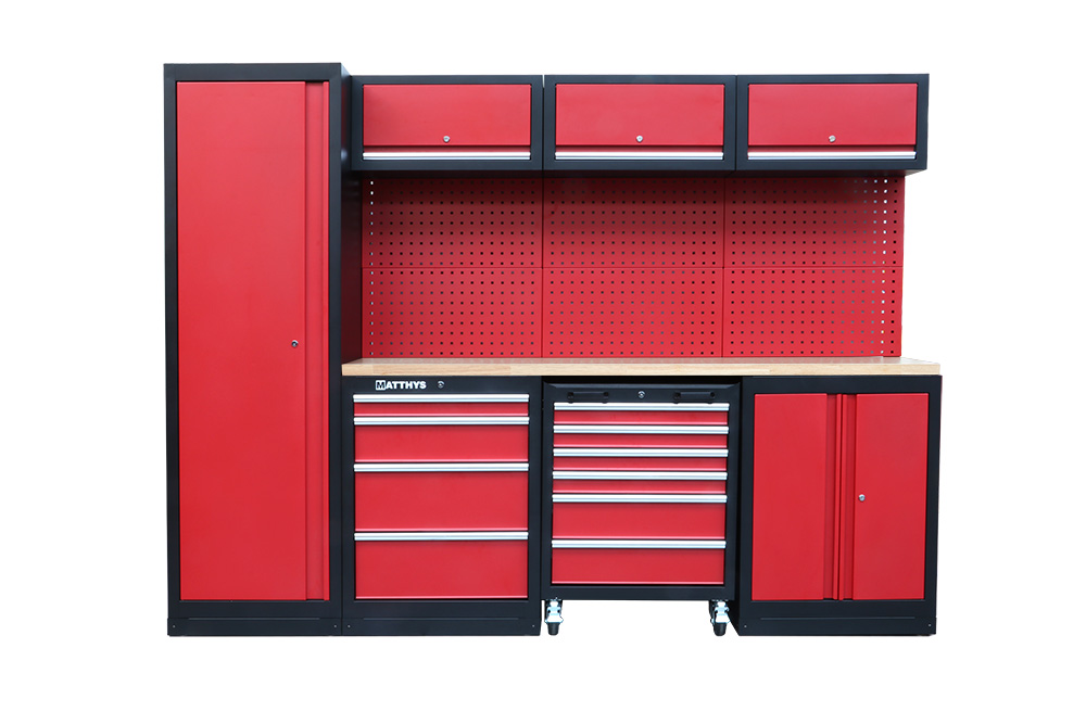 Esta construcción de acero de gran estabilidad con una robusta encimera de Rubberwood aumenta la productividad y la eficiencia en su taller o garaje. Todos los armarios están equipados con cierre centralizado individual, por lo que siempre pueden cerrarse con llave. Las paredes para herramientas también cuentan con la perforación estándar europea, por lo que son ideales para colgar ganchos y otras herramientas útiles. La mesa de trabajo tiene una altura de trabajo ergonómica de 95 cm, lo que le ofrece una posición de trabajo más cómoda que los bancos de trabajo estándar. Todos los muebles de base fija están equipados con patas ajustables para que ni siquiera los suelos más irregulares supongan un problema.
