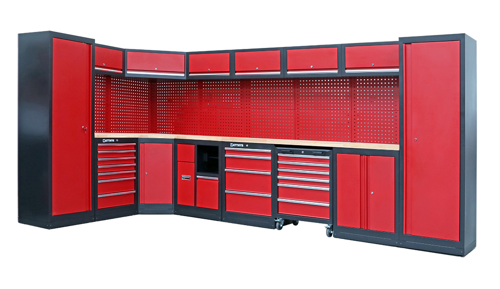Esta construcción de acero de gran estabilidad con una robusta encimera de Rubberwood aumenta la productividad y la eficiencia en su taller o garaje. Todos los armarios están equipados con cierre centralizado individual, por lo que siempre pueden cerrarse con llave. Las paredes para herramientas también cuentan con la perforación estándar europea, por lo que son ideales para colgar ganchos y otras herramientas útiles. La mesa de trabajo tiene una altura de trabajo ergonómica de 95 cm, lo que le ofrece una posición de trabajo más cómoda que los bancos de trabajo estándar. Todos los muebles de base fija están equipados con patas ajustables para que ni siquiera los suelos más irregulares supongan un problema.