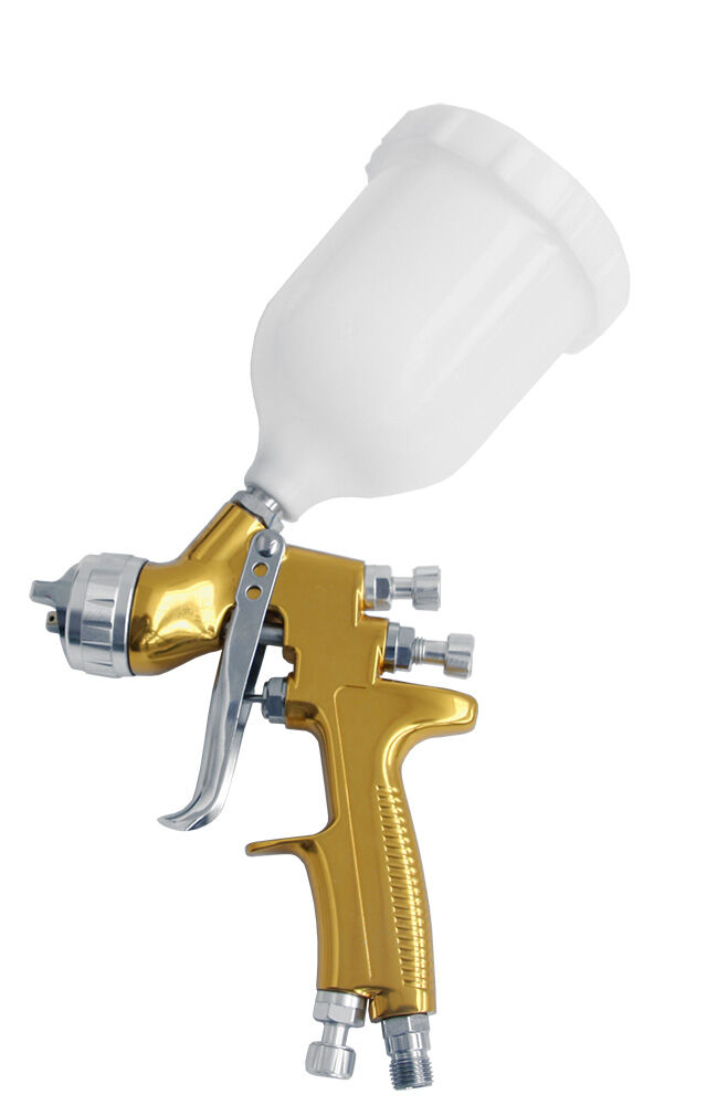Pistola HVLP de calidad superior equipada con una boquilla de acero inoxidable de 1,3 mm que ofrece un acabado comparable al de las pistolas de marcas líderes. Puede utilizarse para pulverizar pinturas con base de disolvente o de agua.