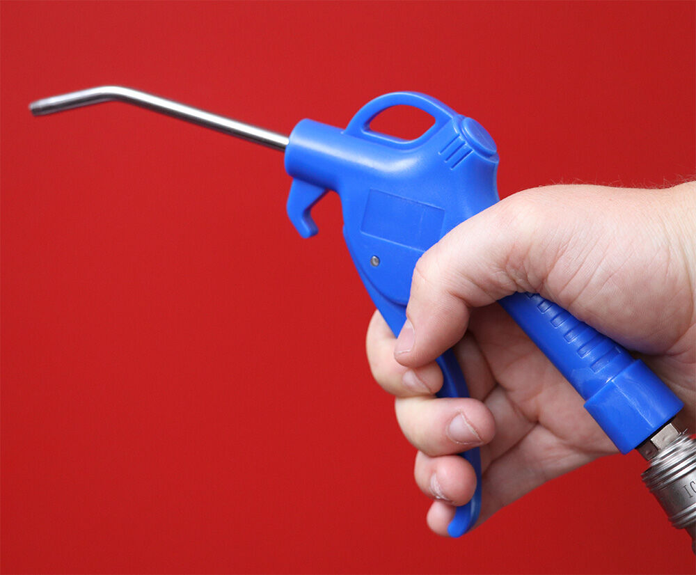 Esta pistola sopladora de plástico cuenta con un tubo de soplado metálico curvado de 100 mm. Por lo tanto, es ideal para soplar superficies limpias y lugares de difícil acceso. El mango está fabricado en POM (polioximetileno), por lo que es muy resistente a los productos químicos. El mango también es muy resistente, ya que absorbe fuertes golpes y vibraciones.