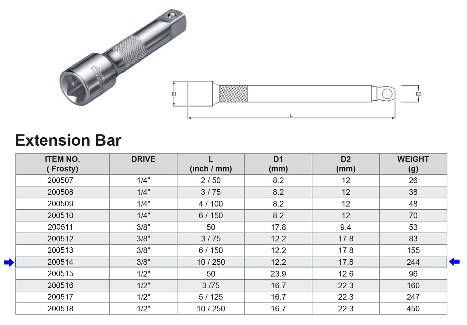 PROLONGADOR 3/8” 250 MM Artículo: 200514