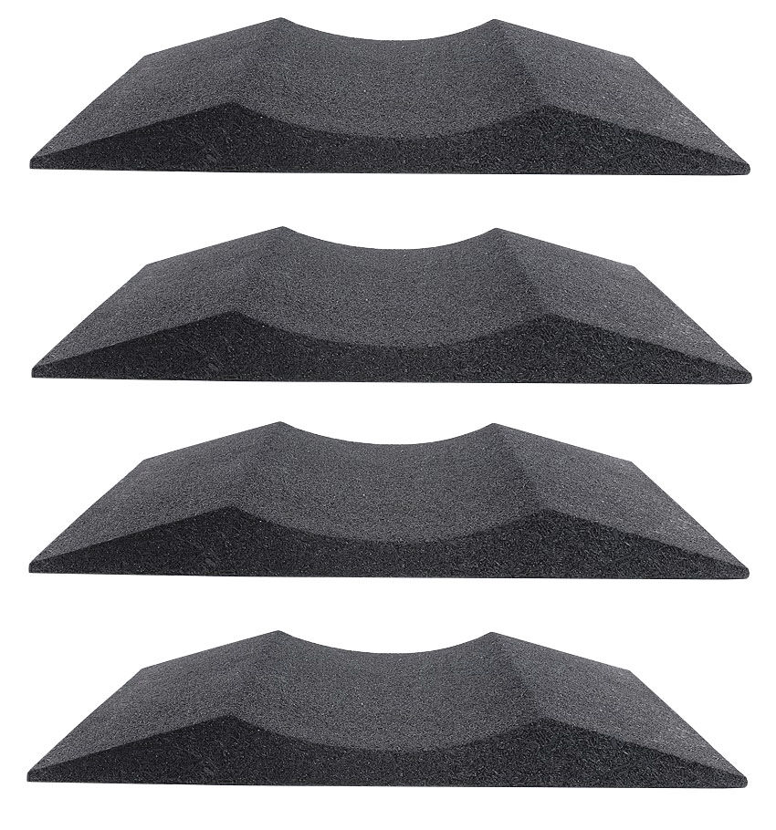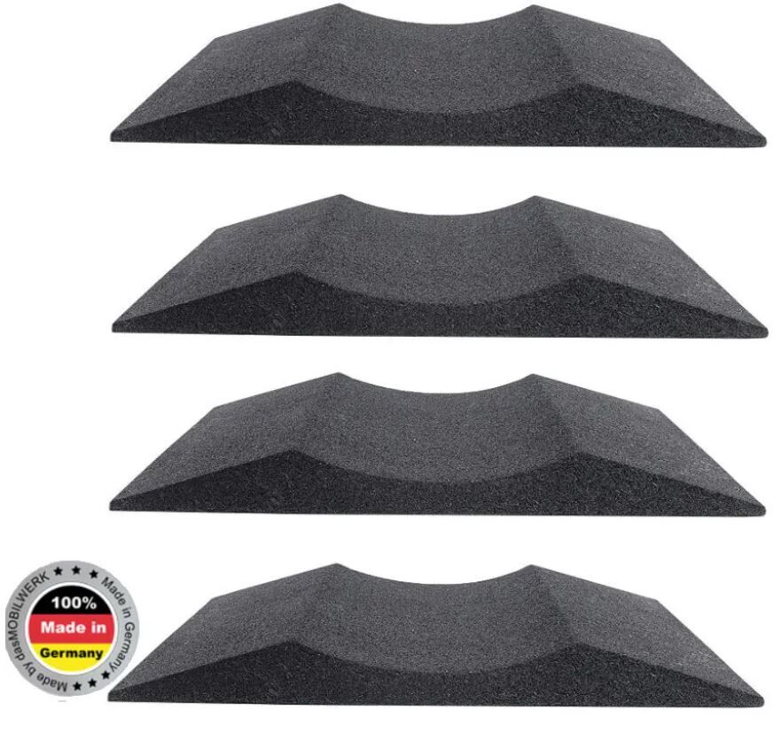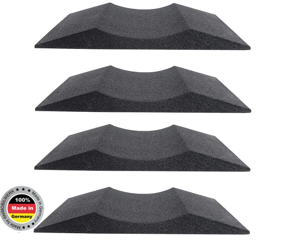 Estos protectores de neumáticos están fabricados con granulado de caucho elástico ligado con PU. Gracias a un proceso de moldeado especial, el protector de neumático se adapta al neumático y no al revés. El protector es más dura en la rampa y más blanda en el lado redondo (la superficie de contacto). Así, se pueden considerar diferentes diámetros de neumáticos. Cuando el neumático está incrustado en el protector de neumático, la presión sobre el neumático se distribuye mucho mejor debido a que la superficie de contacto es mucho mayor. Así se evita un pinchazo en el neumático.