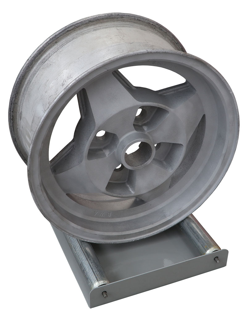 Facilita el chorreado, pintado o pinstriping de llantas. Para chorrear, coloque el rodillo para llantas en la rejilla de la cabina. Coloque la llanta sobre los rodillos, apunte la pistola hacia la llanta y gírela manualmente. Para pintar o pinstriping, gire la llanta y aplique la pintura.