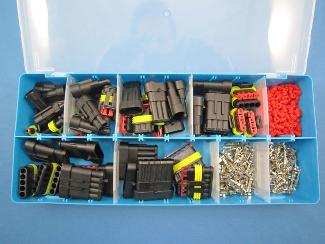 Contiene una selección de cajas de conectores múltiples Superseal de 1 a 6 vías. Se suministra con todos los terminales y juntas necesarios y algunos repuestos. Se suministra en un robusto estuche de plástico con separadores.