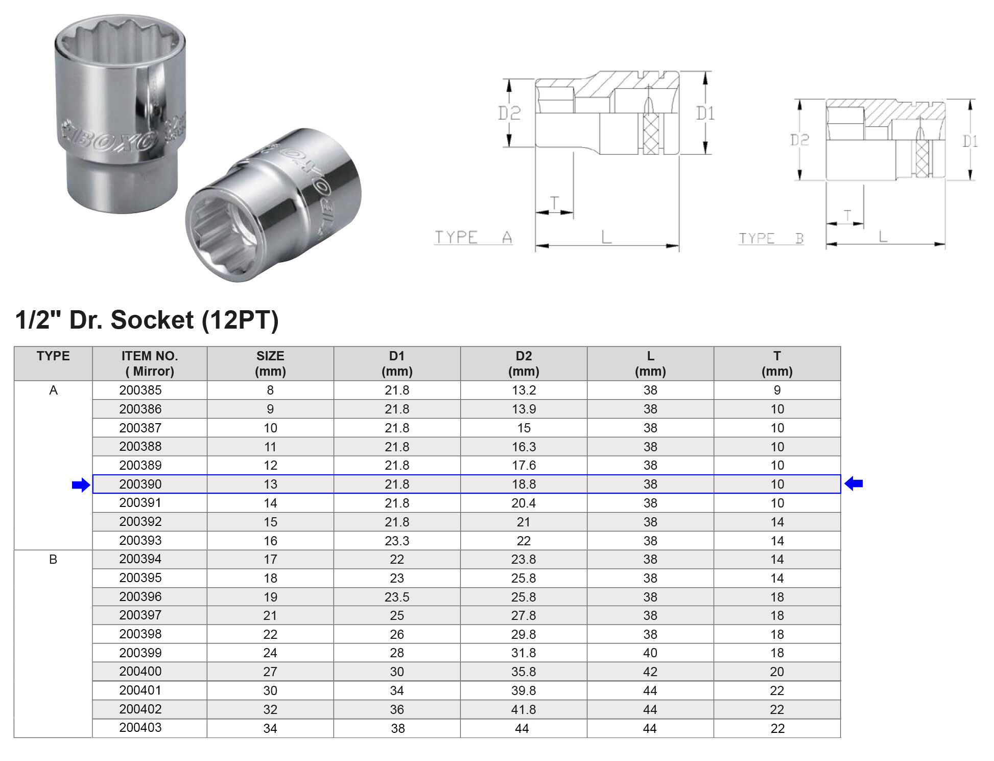 VASO CROMADO 1/2” 12 CARAS MÉTRICO 13 MM Artículo: 200390