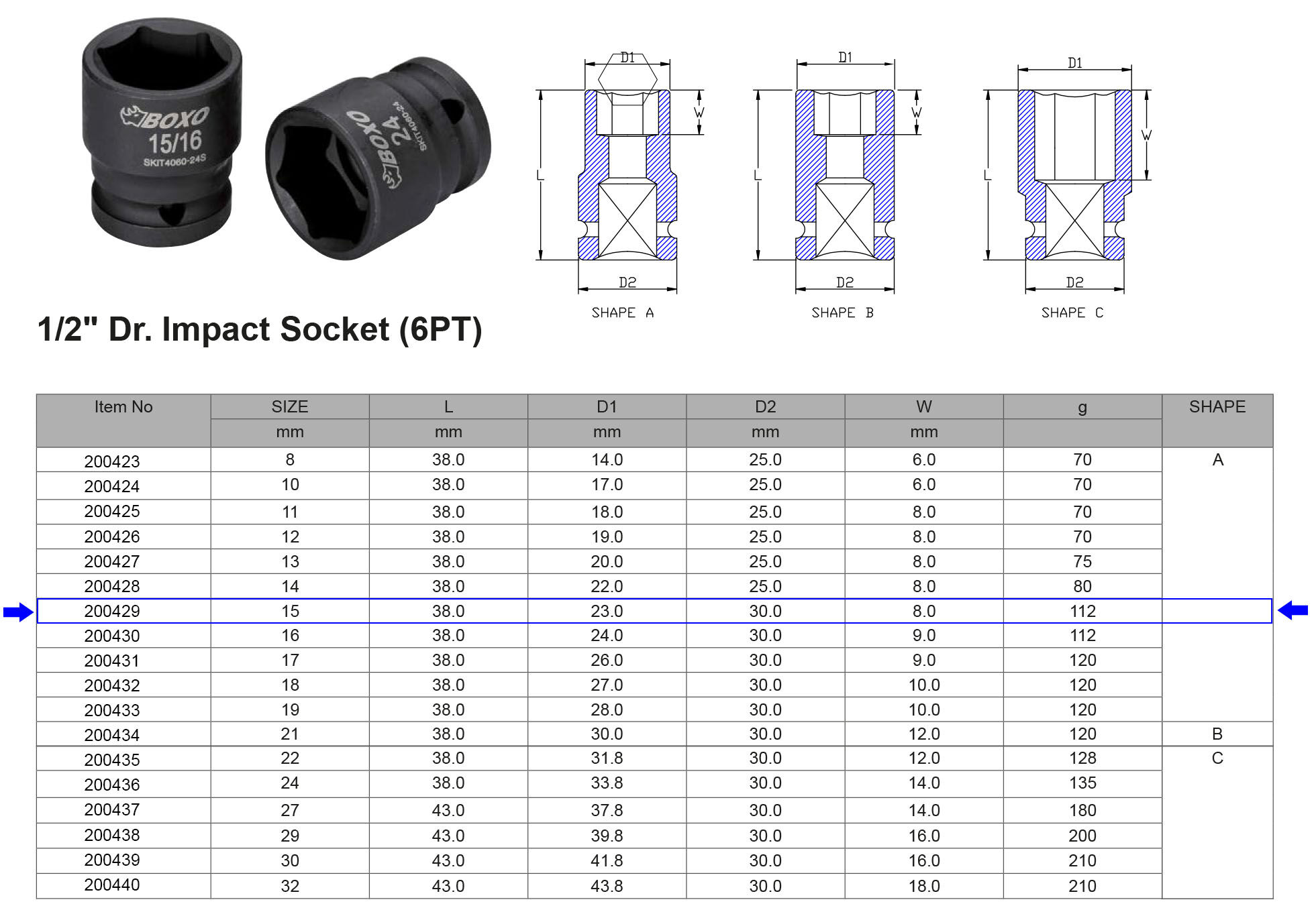 VASO DE IMPACTO 1/2” 6 CARAS MÉTRICO 15 MM Artículo: 200429