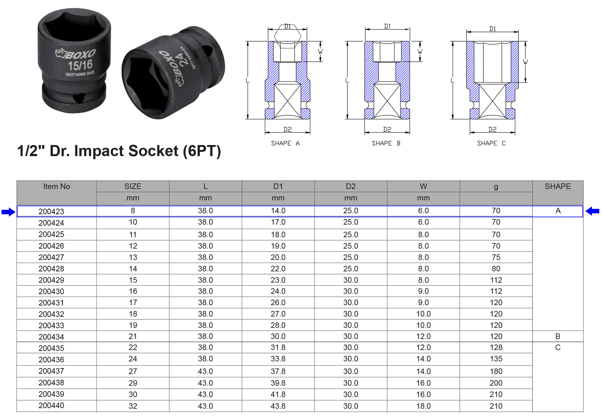 VASO DE IMPACTO 1/2” 6 CARAS MÉTRICO 8 MM Artículo: 200423