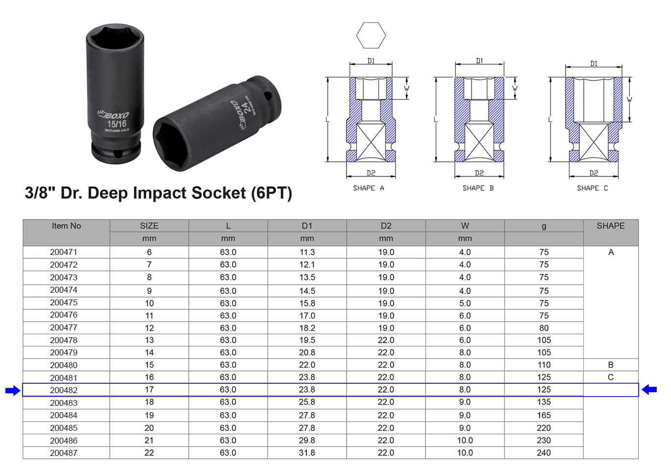 VASO DE IMPACTO LARGO 3/8” 6 CARAS MÉTRICO 17 MM Artículo: 200482
