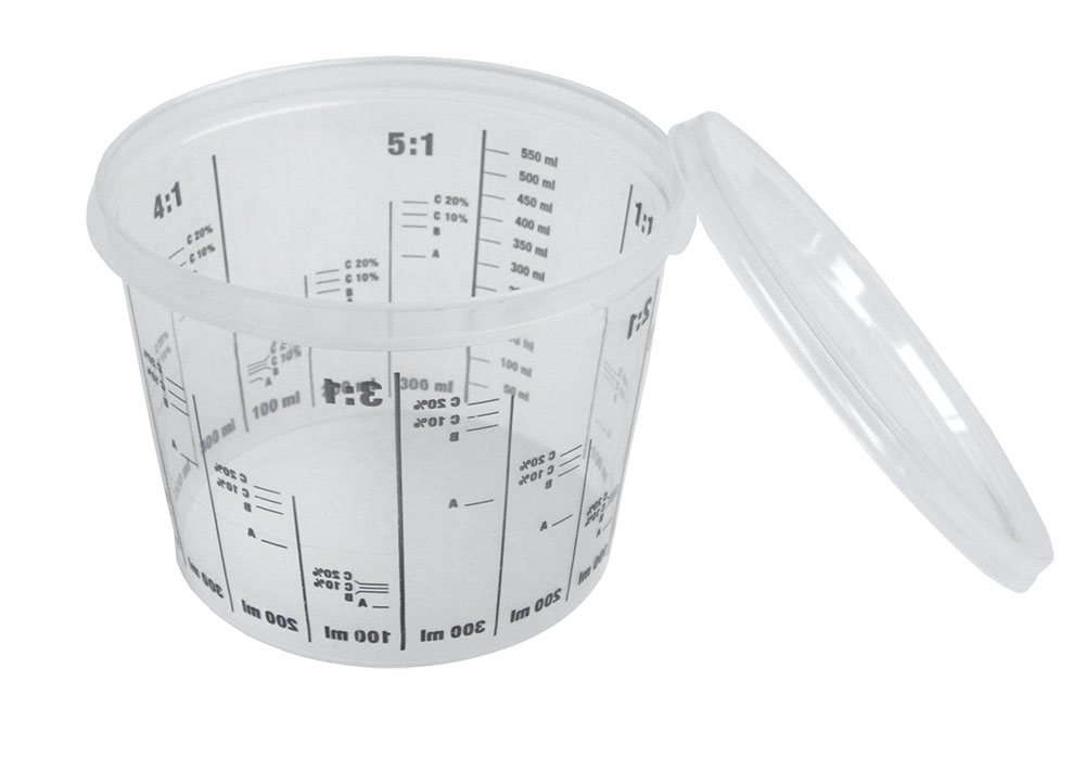 Un juego de 5 vasos mezcladores con proporciones de mezcla preimpresas. Puede cerrar los vasos mezcladores con las tapas suministradas.