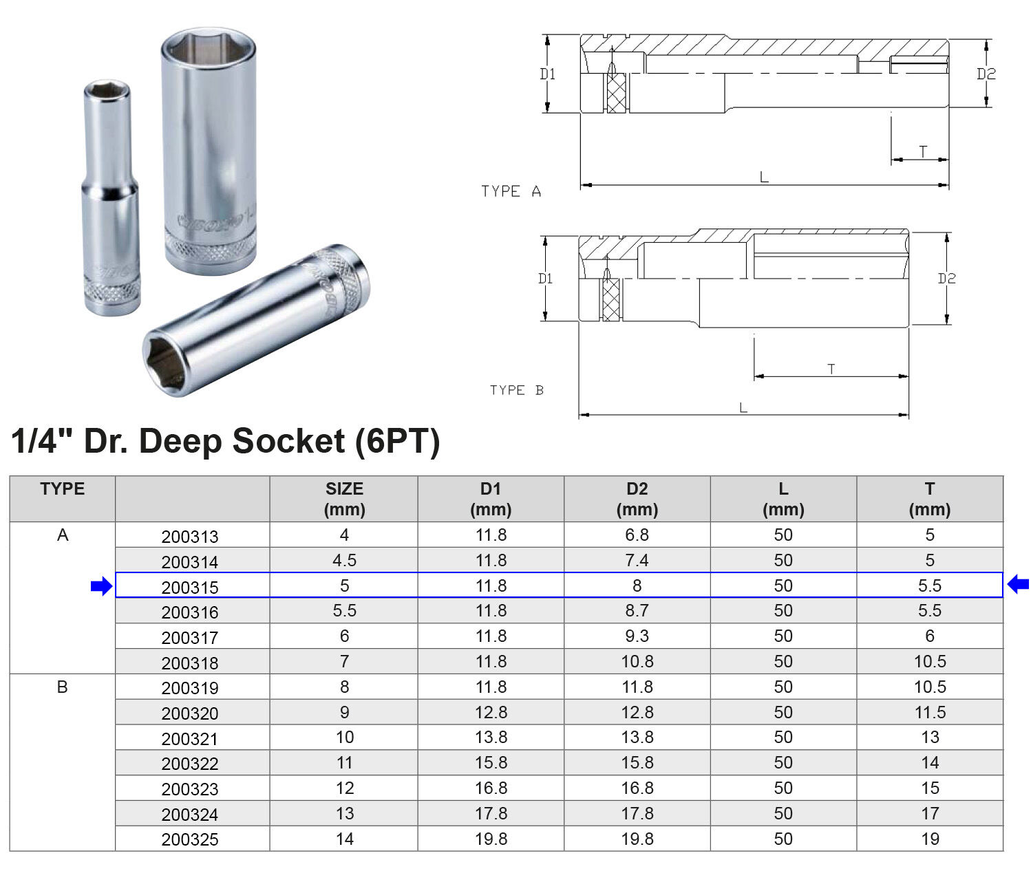 VASO LARGO 1/4” 6 CARAS MÉTRICO 5 MM Artículo: 200315